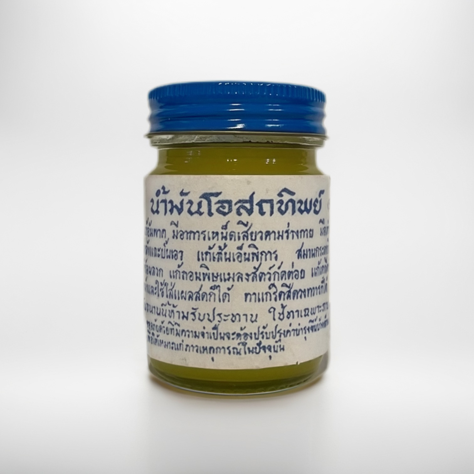 Originálny thajský balzam Osotthip Yellow Balm s horským zázvorom Cassumunar (Plai). Receptúra mníchov z chrámu Wat Pho. Účinná úľava pri svalových bolestiach, kŕčoch a únave. Obľúbený u thajských boxerov. 50g balenie.